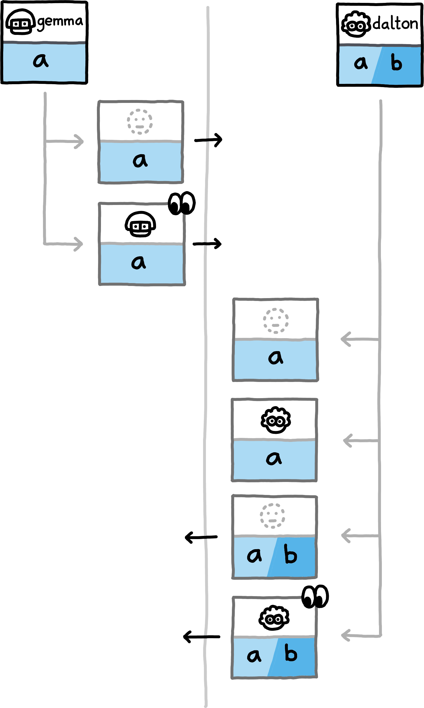 Throughout the following, Alfie and Betty are honest peers, Muriarty is a malicious peer who may deviate arbitrarily from Confidential Sync, and Epson is an active eavesdropper on the networking layer who can read, modify, drop, or insert arbitrary bytes on a Confidential Sync communication channel.