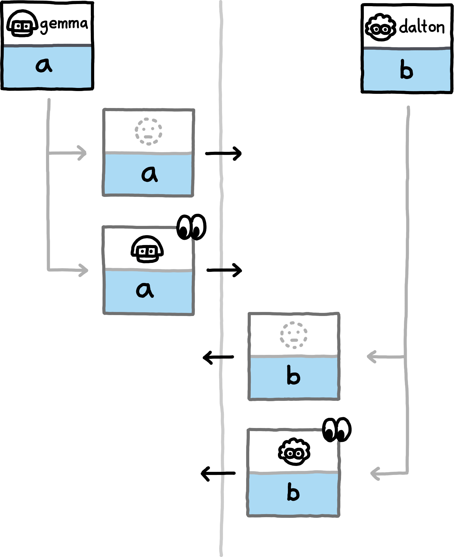 In addition to withholding information from unauthorised peers, we also wish to defend against active eavesdroppers. An active eavesdropper is an attacker who can read and modify all transmissions by the two peers. There exist well-known protections for settings where the two peers have prior knowledge about each other before they start the connection, but we also want to allow for sync between anonymous peers who do not know each other at all. Hence, even after the other peer has proven to us that they have access to some data, we still must be careful about what we send (or rather, how we encrypt it).